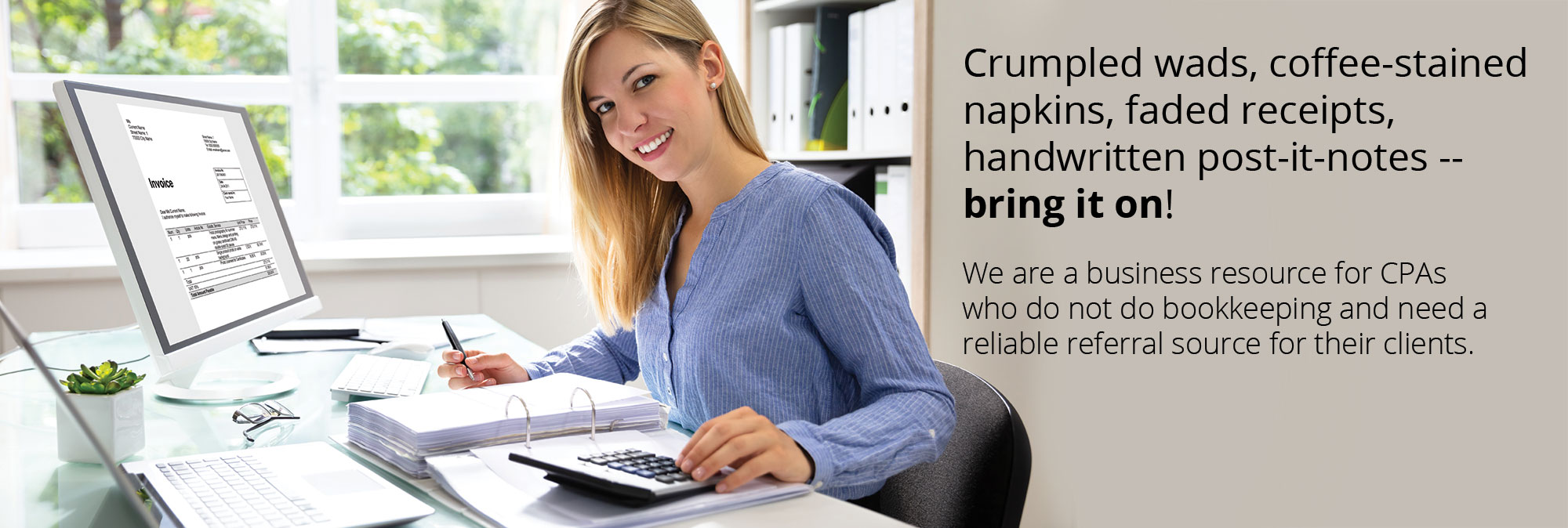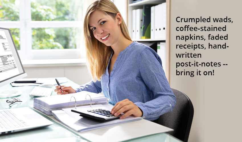 Crumpled wads, coffee-stained napkins, faded receipts, handwritten post-it-notes -- bring it on! Our super-human staff organizes the scraps then pieces together the financial puzzle for you into one complete set of books.